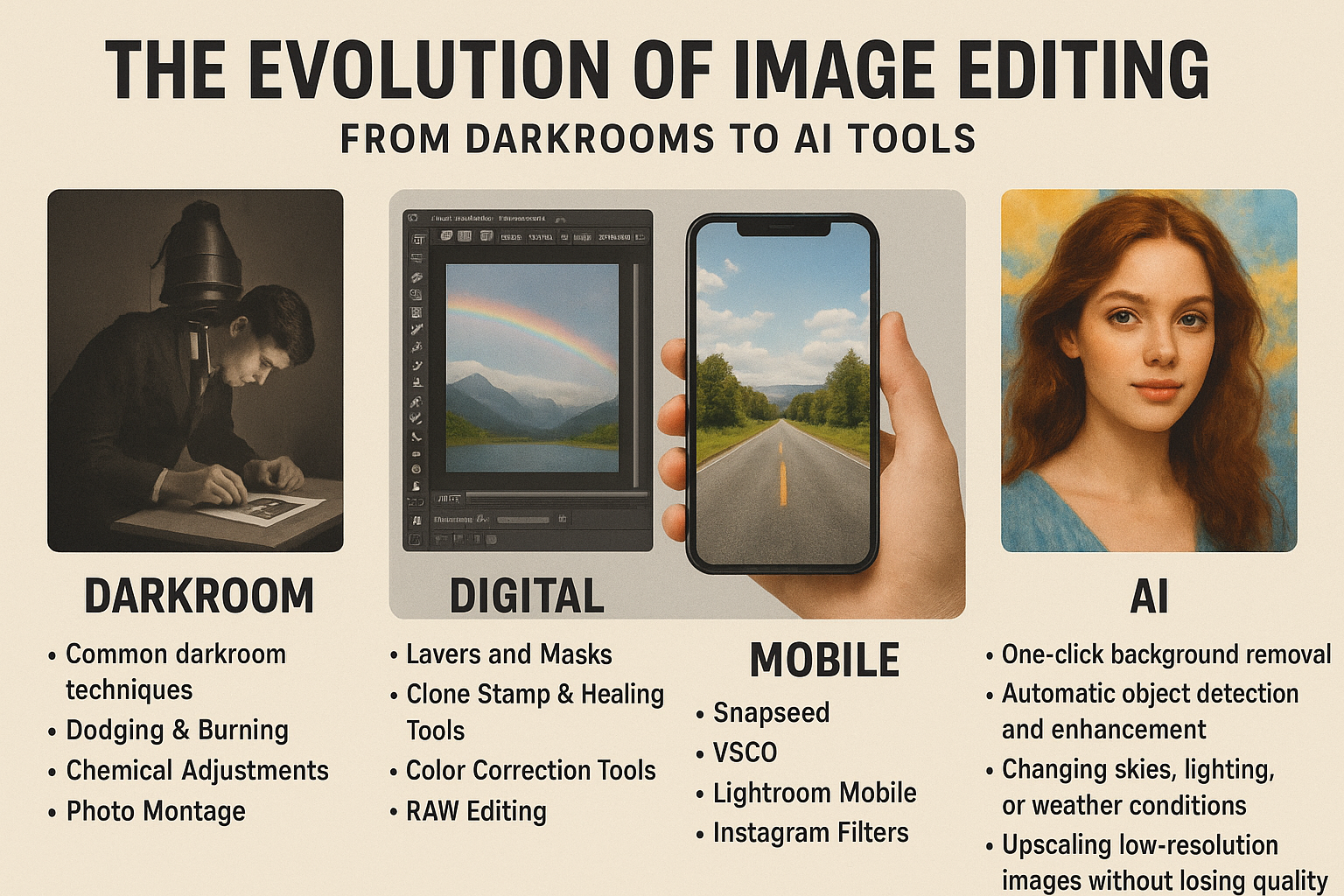 Image editing has come a long way—from chemical-filled darkrooms to sophisticated artificial intelligence tools that can transform photos with a single click. As photography and technology evolved side by side, the way we enhance images has continuously shifted, becoming faster, more accessible, and more creative. Today, AI has revolutionized editing workflows, making advanced capabilities available to everyone—not just professional photographers.